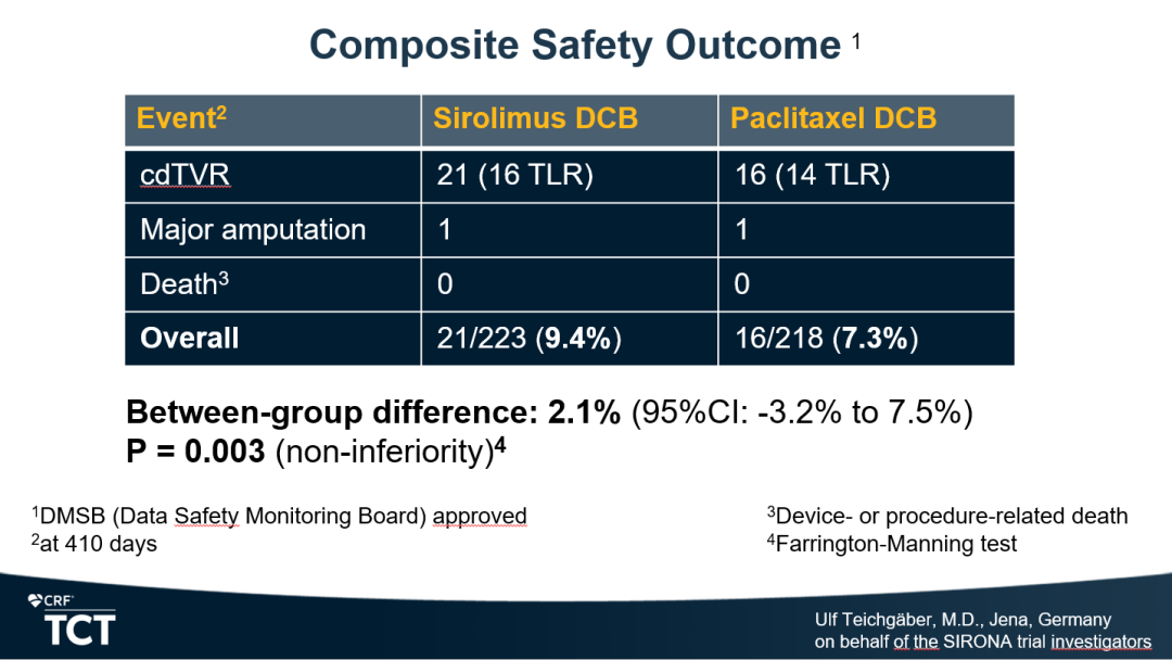 西罗莫司DCB与紫杉醇DCB的直接比较显示,研究组之间的结果具有可比性。西罗莫司DCB的主要通畅性不劣于紫杉醇DCB;组间无cdTLR结果无显著差异;临床功能改善相似;西罗莫司DCB的安全性不劣于紫杉醇DCB。