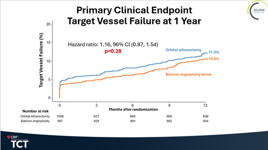 主要临床终点为一年随访时靶血管失败(TVF),定义为心源性死亡、靶血管相关心肌梗死或因缺血驱动的靶血管血运重建的复合事件。轨道斑块旋切术组的TVF发生率为11.5%,而传统球囊扩张术组为10.0%(风险比 1.16 [96%置信区间 0.87, 1.54],P=0.28)。两组的次要终点(手术成功率和无需转为其他治疗策略的成功率)也相似。