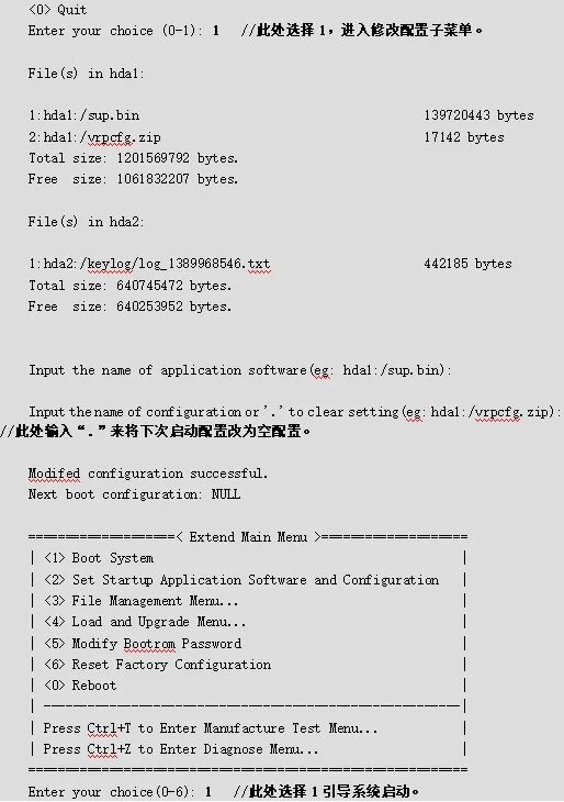 通过Console口连接设备并重启设备。在设备启动过程中,看到提示信息“Press Ctrl+B to Enter Main Menu…3”时按下Ctrl+B,输入BootROM密码后,进入扩展段BootROM主菜单,按如下步骤将设备配置为空配置启动。