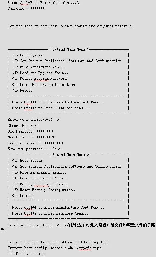 说明:缺省的BootROM密码为,如果使用缺省值登录后,为了提高安全性,建议在进入扩展段BootROM主菜单后选择5进行修改。密码修改后请妥善保管以免丢失。