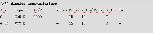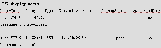 使用display users命令查看所有登录账号,其中带有“+”标记一行为当前管理员,记录对应的编号VTY 0。