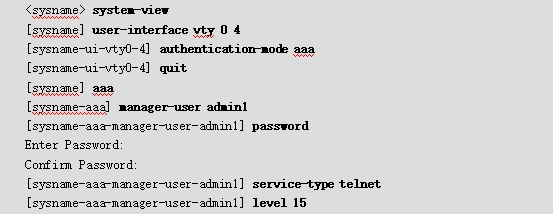说明:VTY是设备为Telnet登录创建的逻辑接口,根据管理员登录的次序依次为其分配VTY0~4(或0~14)接口供其使用。因为无法为管理员指定其登录使用的VTY接口,所以一般会对所有的VTY接口进行相同的配置。