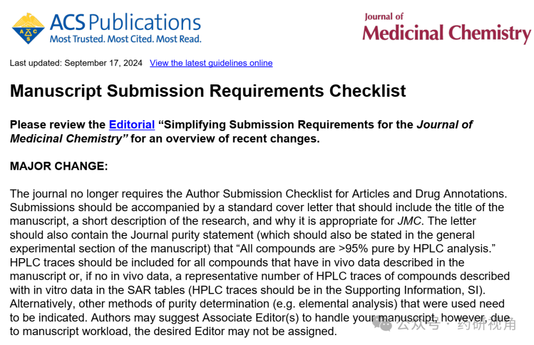 对于Articles和Drug Annotations,期刊不再要求提交作者提交清单(Author Submission Checklist)。提交的稿件应附上标准的cover letter,内容应包括稿件标题、研究的简要描述,以及为何该研究适合《JMC》期刊。信中还应包含期刊纯度声明(该声明也应在稿件的一般实验部分中说明),即“所有化合物经HPLC分析纯度均>95%”。对于稿件中描述的所有具有体内数据的化合物,必须包含HPLC色谱图;如果没有体内数据,则需提供在SAR表中描述的化合物的代表性HPLC色谱图(HPLC色谱图应在支持信息(SI)中)。另外,也需要指明使用了其他的纯度测定方法(例如元素分析)。作者可以建议副编辑处理您的稿件,但由于稿件的工作量,所期望的编辑可能无法被指派。