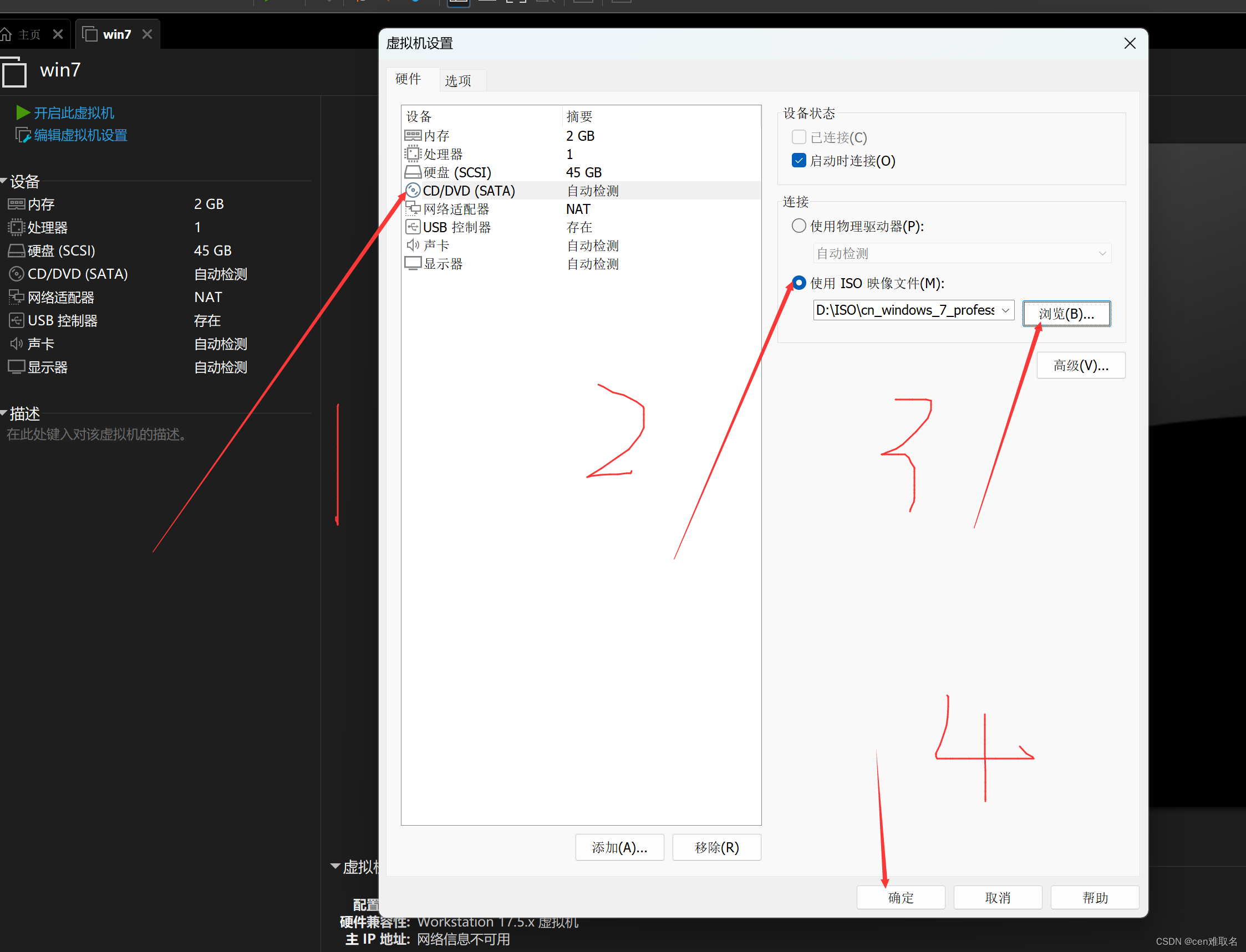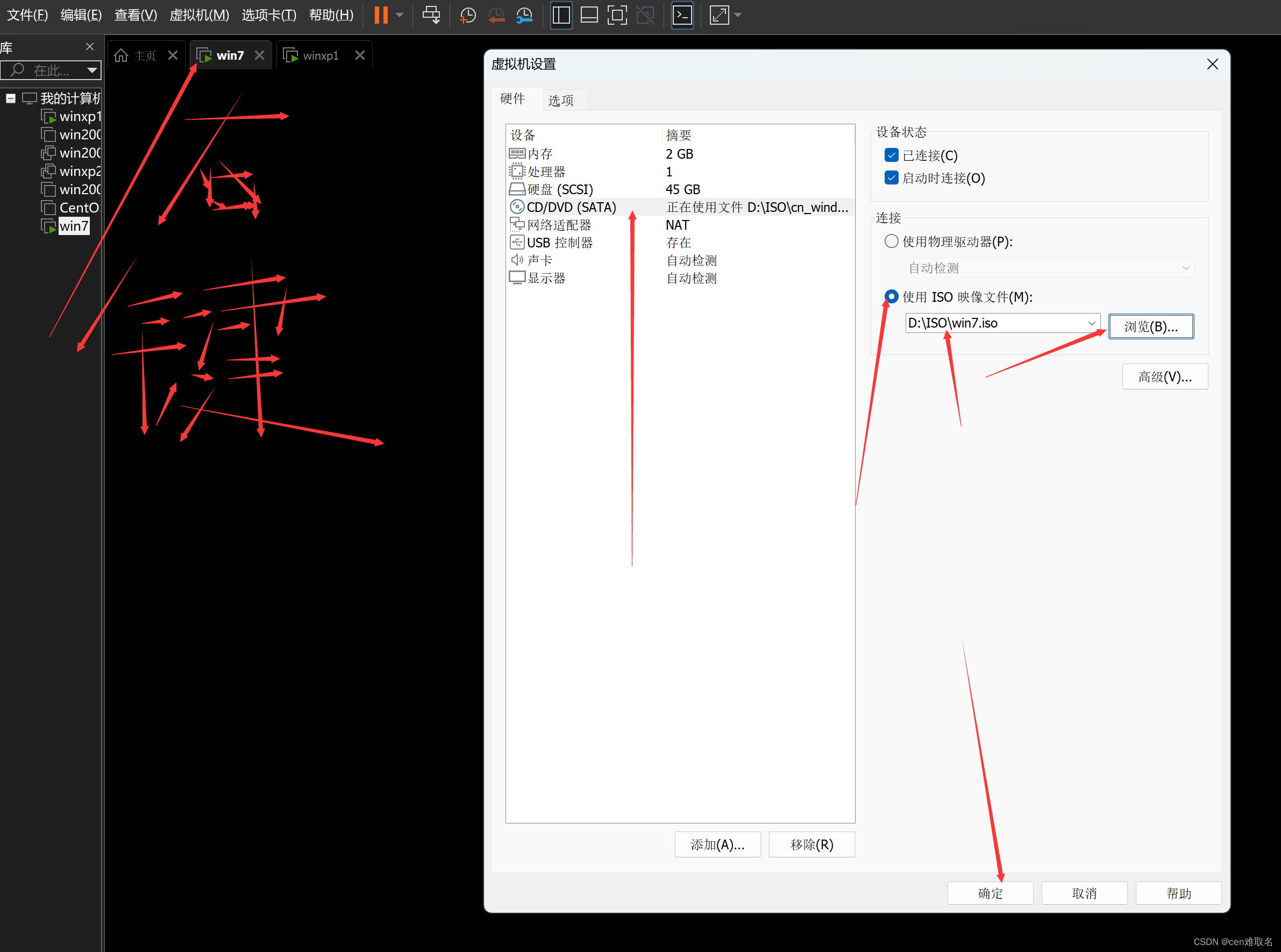 右键win7(即此处箭头所指)->设置->CD/DVD(STAT)->使用iso映像文件->浏览(将之前下载的iso文件放入)->完成