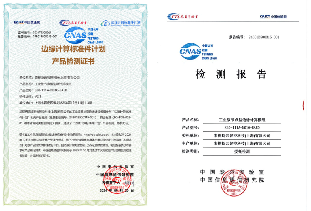 经过中国信息通信研究院集中测试,索提斯云智控科技(上海)有限公司自主研发的工业级节点型边缘计算模组S20顺利通过“边缘计算标准件计划”产品测试,并已在多个行业领域实现工厂级部署及稳定运行,助力各行各业打通IT与OT连接,赋能企业数字化转型。