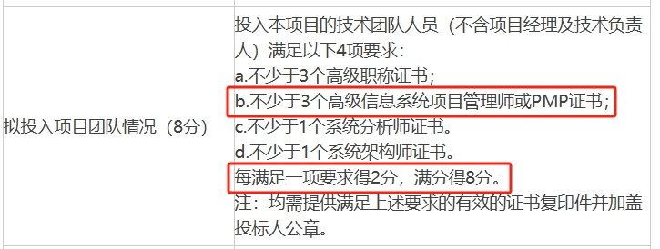 北京市公共资源交易服务平台,发布了一则“2023-2024年度视频监控系统维护项目(第1包)”的更正公告,公告中明确提到:不少于3个高级信息系统项目管理或PMP®证书,每满足一项要求可得2分!