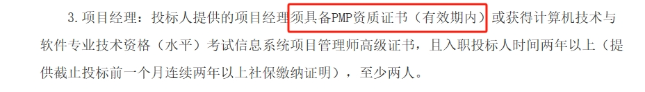 深圳某国企公司的招标公示中,也明确规定:投标人提供的项目经理必须具备PMP®资质证书(有效期内)。