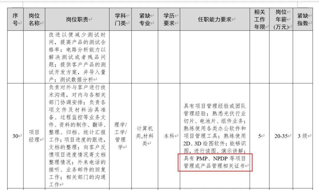 其中重点产业紧缺人才需求目录中对项目经理的任职能力要求规定如下:具有NPDP、PMP®等项目管理和产品管理相关证书,其紧缺指数为3级,岗位年薪可达20-35W。