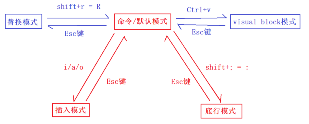 vim是一个多模式的编辑器。我们目前使用vim能接触到的有五种模式:命令/正常/普通模式,插入模式,底行模式,visual block模式。但是重点掌握前三种模式。