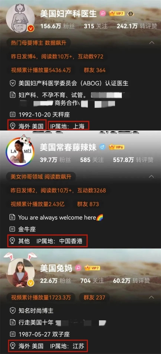 以美国为例,从@美国妇产科医生 到@美国常春藤辣妹、@美国兔妈,他们的IP属地分别在我国的上海市、香港特别行政区和江苏省。而在上述三位博主微博自行填写的资料中,地址基本上都是“海外”“海外 美国”。