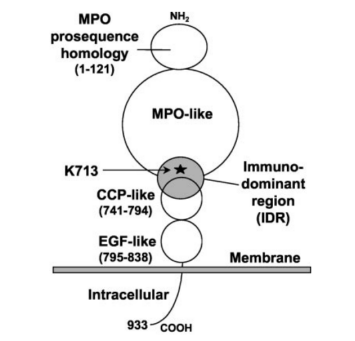 TPO分子由933个氨基酸残基组成,具有一个跨膜区,细胞外部分主要由髓过氧化物酶(MPO)样结构域、补体控制蛋白(CCP)样结构域及表皮生长因子(EGF)样结构域组成。TPO的MPO样结构域是其主要的功能区,与甲状腺激素合成直接相关。