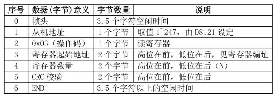 现在以 MODBUS-RTU 协议为例,说明通讯帧的典型格式:请求帧格式:从机地址+0x03+寄存器起始地址+寄存器数量+CRC 检验。