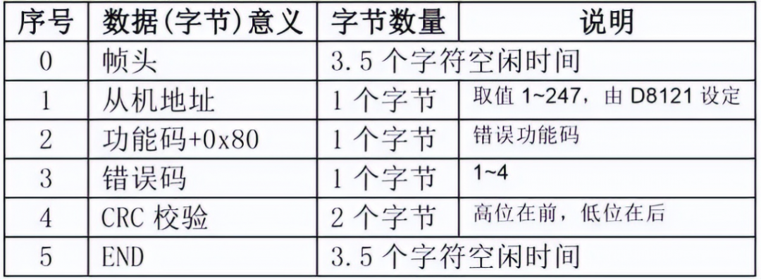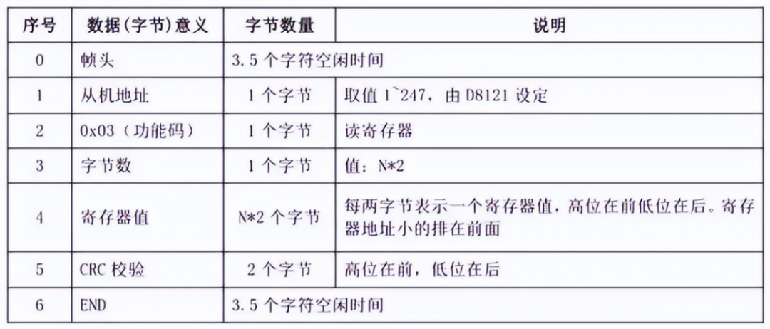 正常响应帧格式:从机地址+0x03+字节数+寄存器值+CRC 检验;