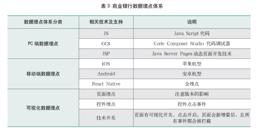 从技术角度考虑,商业银行数据埋点体系包括PC端、移动端数据埋点和可视化数据埋点(详见表3)。