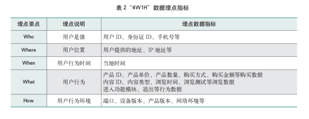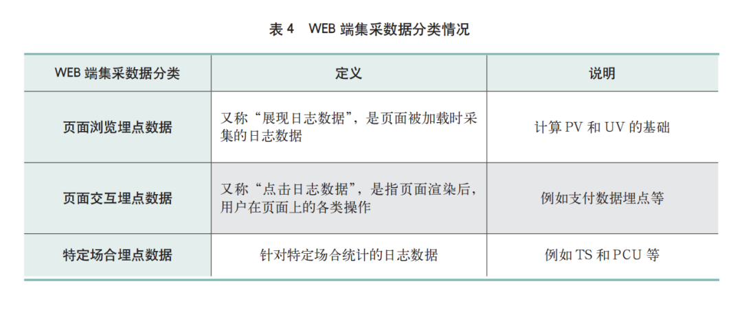 WEB端集采的数据种类可分为三类:页面浏览埋点数据、页面交互埋点数据和特定场合埋点数据(详见表4)。