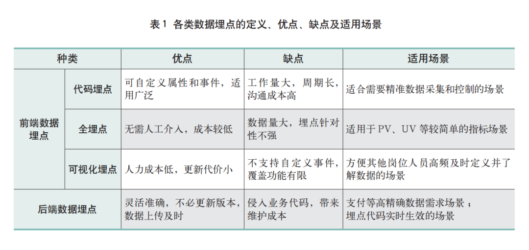 根据数据埋点不同位置,其可分为前端数据埋点和后端数据埋点。各类数据埋点的定义、优缺点及适用场景情况详见表1。