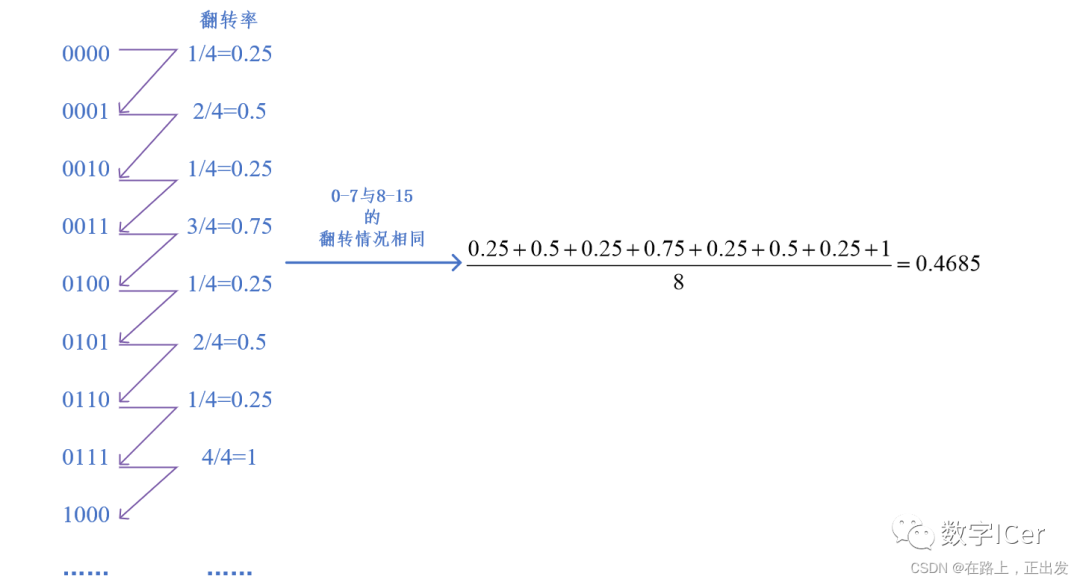 9、4bit二进制计数器,其翻转率(Toggle Rate),每时钟都翻转按照100%来算)大约是()
