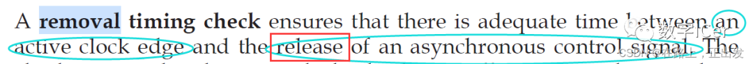 D:removal时间,即去除时间,异步控制信号撤离时刻与本次有效时钟边沿的时间间隔。原文如下: