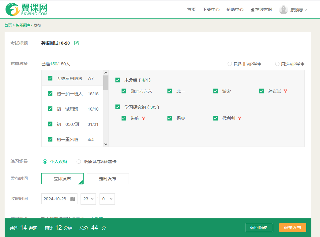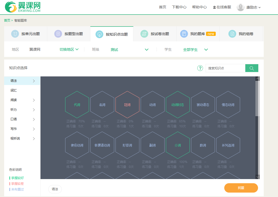 翼课网的【智能题库】拥有多样化的出题方式。在【按知识点出题】功能里,教师可依据“智慧蜂巢”图展示的知识点掌握状况,为学生挑选合适的知识点,随后一键查找题目,将试题添加至题库后推送给学生。