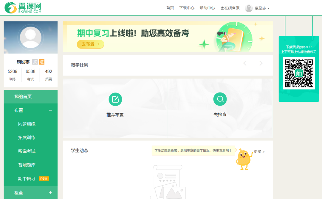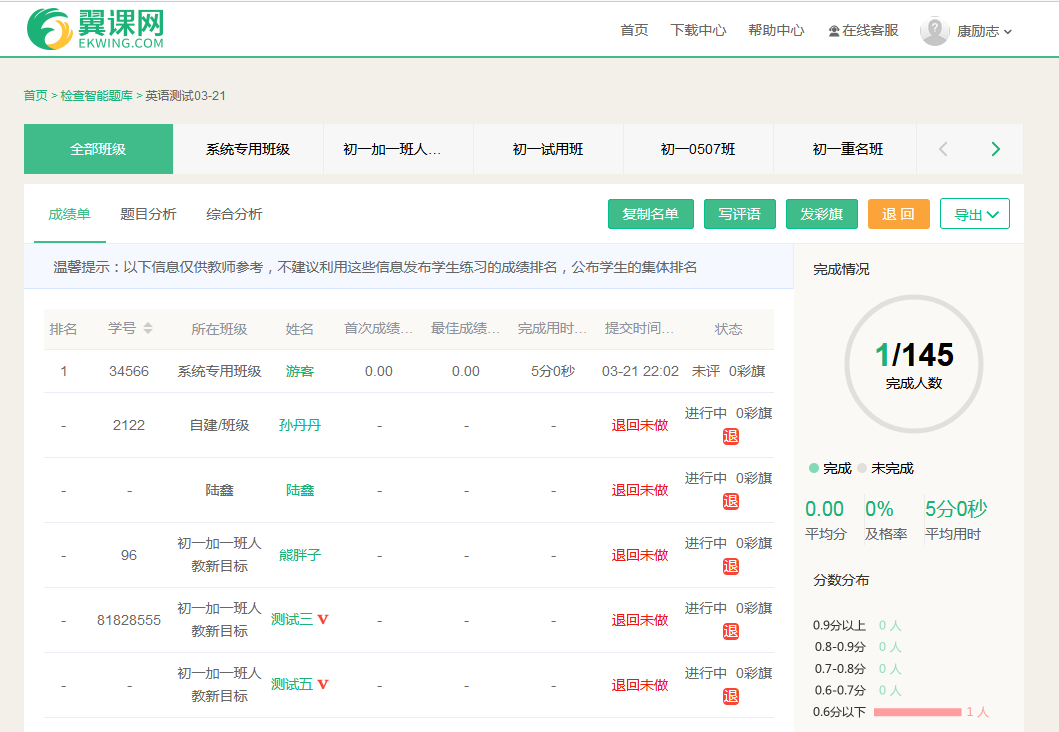 学生完成训练后,系统自动批改,教师在翼课网首页的【检查】,可查看完成情况,还能给学生写评语,发放彩旗!