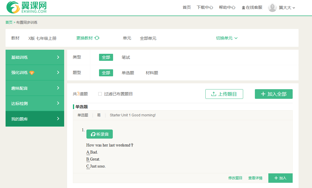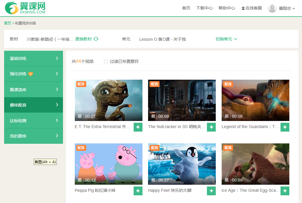 翼课网的【同步训练】紧密衔接教材内容,覆盖主流英语教材版本。该栏目资源丰富,包括基础训练、强化训练、翼课读库、趣味配音、达标检测,辅助教师课前、课中、课后全流程教学。