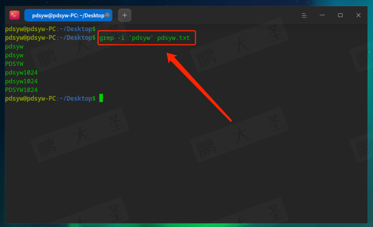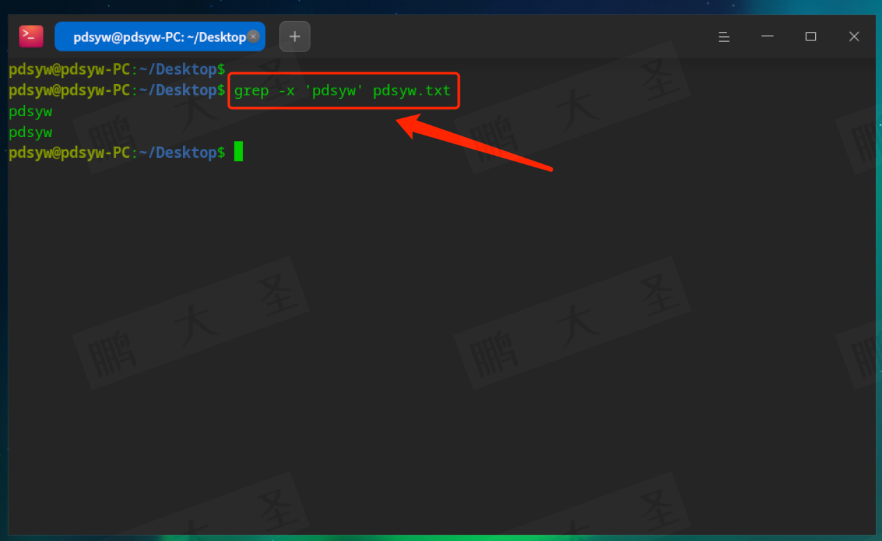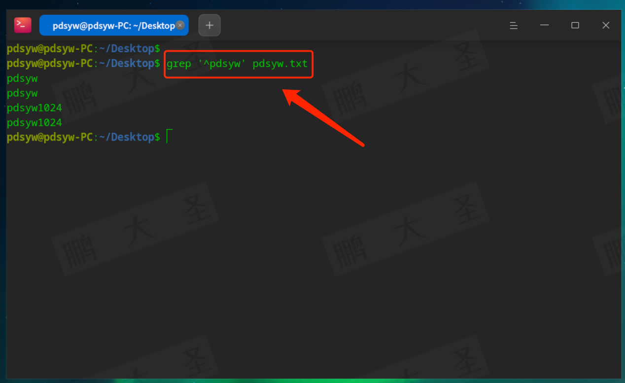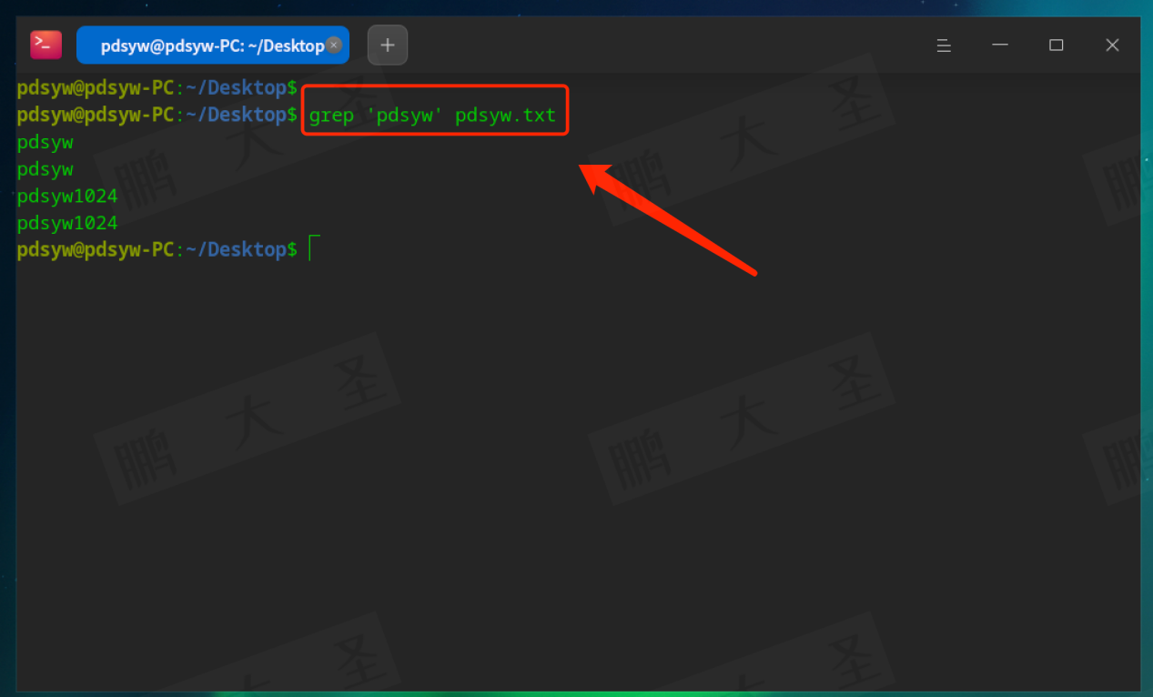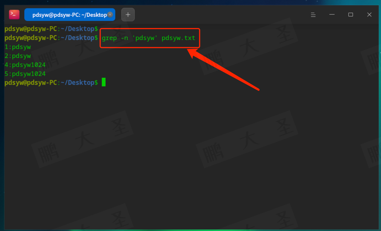 例如,在pdsyw.txt文件中查找包含“pdsyw”的行: