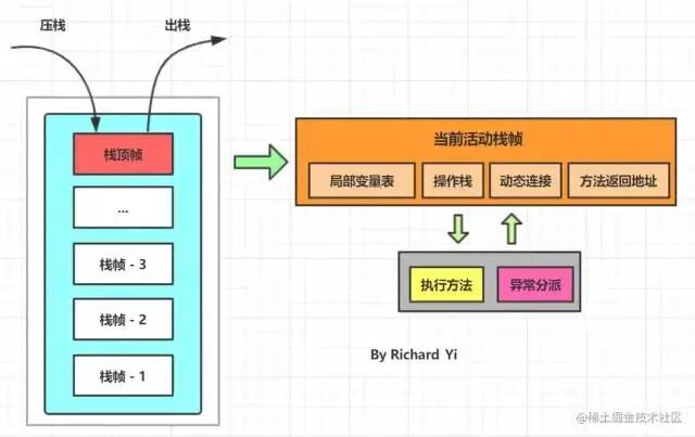 栈帧(Stack Frame)是用于支持虚拟机进行方法调用和方法执行的数据结构。栈帧存储了方法的局部变量表、操作数栈、动态连接和方法返回地址等信息。每一个方法从调用至执行完成的过程,都对应着一个栈帧在虚拟机栈里从入栈到出栈的过程。