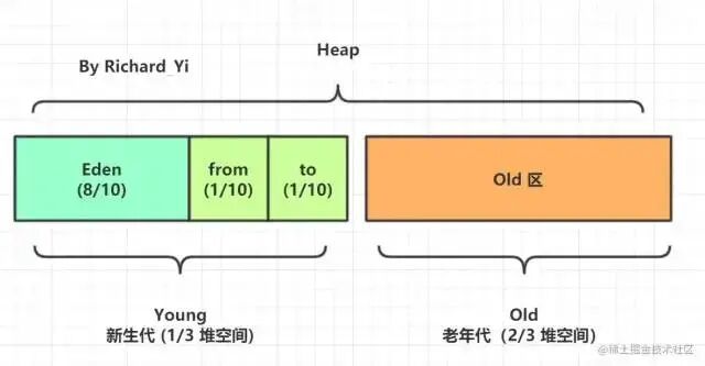因为新生代是由Eden + S0 + S1组成的,所以按照上述默认比例,如果eden区内存大小是40M,那么两个survivor区就是5M,整个young区就是50M,然后可以算出Old区内存大小是100M,堆区总大小就是150M。