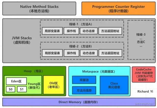 上图描述了当前比较经典的Java内存布局。(堆区画小了2333,按理来说应该是最大的区域)