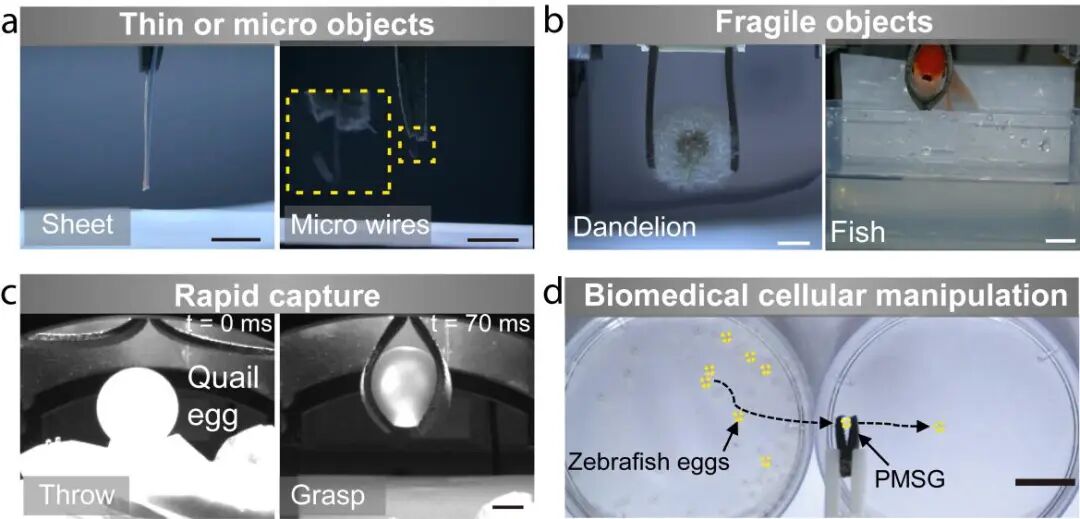 ▲软体抓手的多功能性展示:(a)抓取薄板和细线;(b)抓取鱼和蒲公英;(c)抓取去壳生蛋;(d)安全移取斑马鱼卵。