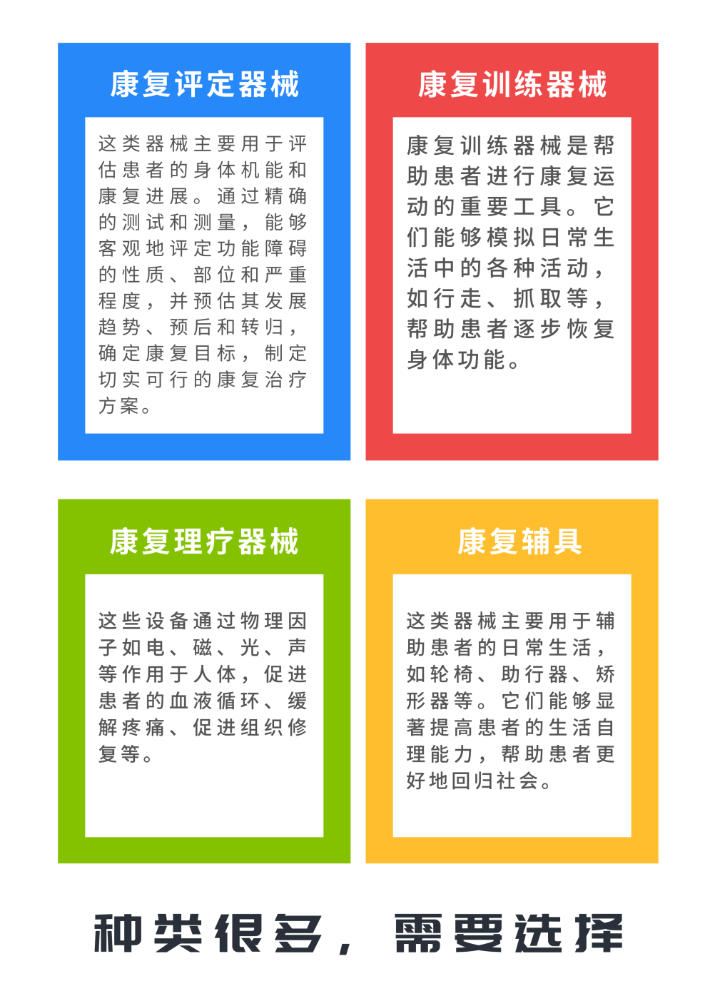 当前,康复医疗器械的种类繁多,按照功能与应用领域的不同,可以划分为: