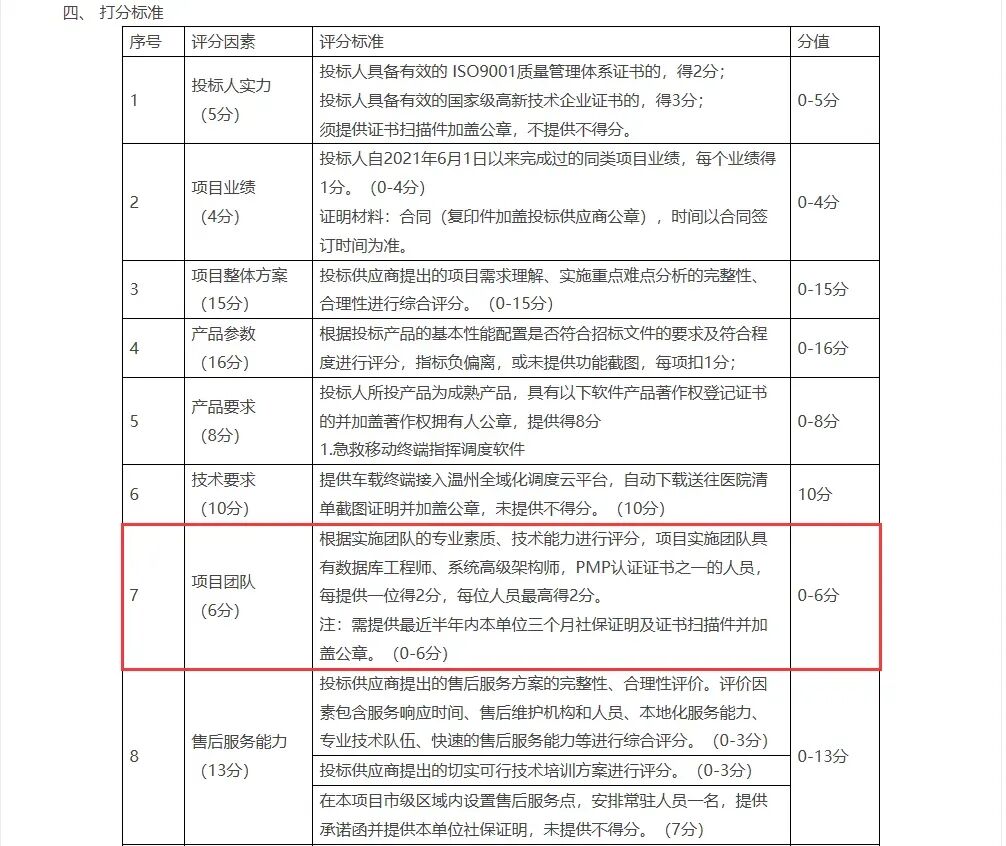 例如,《永嘉县人民医院关于急救中心信息化配套项目洽谈公告(第二次)》这份招标文件就明确提出,项目团队中拥有PMP®持证人员,每提供一位就能够得两分。