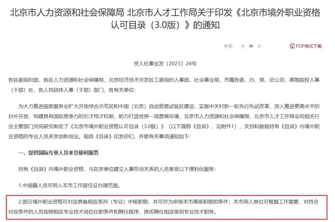 以北京为例,2023年北京人社局发布了北京市人才工作局关于印发《北京市境外职业资格认可目录(3.0版)》的通知,通知中指出北京市对于目录中包含的职业资格认证人员延续6项便利服务。