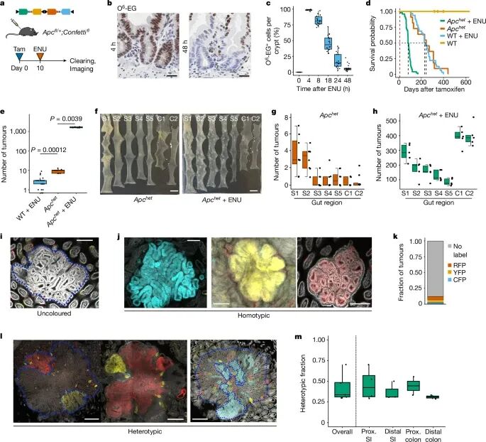 a. 实验方法示意图。Tam,指代他莫昔芬。b. ENU处理后小肠隐窝中O-6-乙基鸟嘌呤(O6-EG)的免疫组化染色。比例尺,25微米。c. 随时间变化的O6-EG阳性率的抖动图。每个时间点n=3只小鼠;每只小鼠评分7个肠道区域。d. Apchet+ENU、Apchet、野生型(WT)+ENU和野生型小鼠直至人道终点的Kaplan-Meier曲线。Mantel-Cox P值<0.0001。Apchet+ENU组n=49只小鼠,Apchet组10只,野生型+ENU组32只,野生型组5只。e. 指定条件下每只小鼠的肠道肿瘤数量。Apchet+ENU组n=5只小鼠,Apchet组8只,野生型+ENU组20只。双侧Wilcoxon秩和检验。f. Apchet和Apchet+ENU的代表性全貌图。S1-S5,小肠;C1,近端结肠;C2,远端结肠。比例尺,10毫米。g,h,肿瘤负担的区域差异。Apchet组n=8只小鼠(g),Apchet+ENU组5只(h)。i,j,代表性共聚焦显微镜图像显示未着色肿瘤(i)和三个同型肿瘤的例子(j)。比例尺,200微米。k,同型肿瘤中Confetti标签的频率。基于1352个肠道肿瘤的计数。n=5只小鼠。l,显示三个异型肿瘤的例子的共聚焦显微镜图像。m,异型分数的平均值和区域分布。n=5只小鼠。Prox.,近端;SI,小肠。比例尺,500微米。在所有箱线图中,中间线显示中位数,底部铰链显示25%分位数,顶部铰链显示75%分位数,底部须显示大于或等于底部铰链减去1.5倍四分位距(IQR)的最小观测值,顶部须显示小于或等于顶部铰链加上1.5倍IQR的最大观测值。