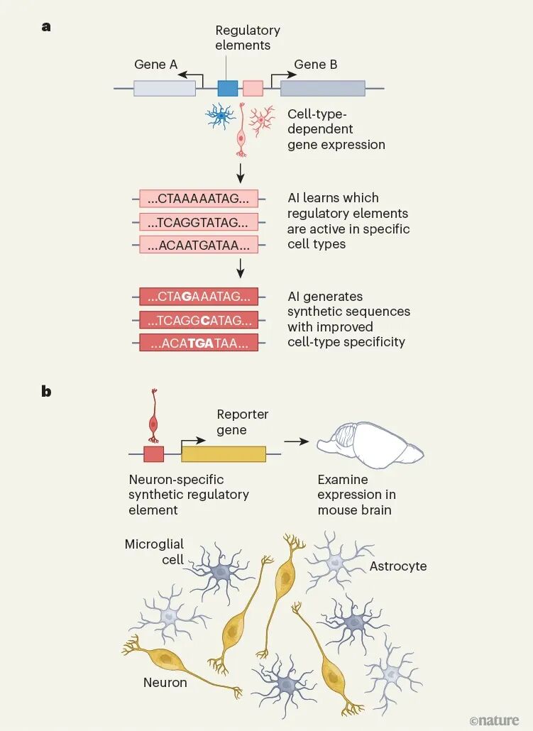 图 1:人工智能辅助设计调控基因表达的序列。a, 在基因组中,被称为调控元件的短序列以依赖细胞类型的方式控制基因表达。Gosai 等人1 利用高通量基因组实验数据训练人工智能(AI)模型,这些数据报告了在特定细胞类型中活跃的数十万个调控元件。然后,该模型生成了数十万个合成序列,这些序列对细胞类型的特异性高于自然出现的序列。b, 体内测试表明,在候选神经元特异性合成序列(红色)的影响下,报告基因(黄色)在小鼠大脑的神经元中表达,而在小胶质细胞或星形胶质细胞中不表达。这种细胞类型特异性基因表达对于针对特定细胞群的基因疗法可能很有价值。