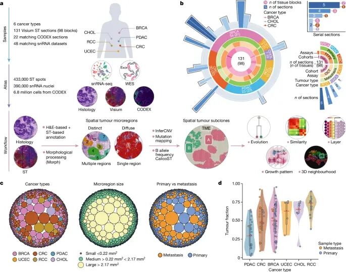 a.来自 6 种不同癌症类型的 131 个 Visium ST 切片的样本、数据类型和工作流程概览,以及 22 和 48 个各自匹配的 CODEX 和 snRNA 数据集。数据包括 54 个 BRCA、30 个 CRC、23 个 PDAC、12 个 RCC、5 个 UCEC 和 7 个 CHOL 样本。下图为生成空间肿瘤微区、推断空间肿瘤亚克隆和进行下游分析的工作流程。根据肿瘤区域的分布,我们将样本分为空间上不同的样本群和空间上弥散的样本群。分析包括肿瘤亚克隆演化分析、转录相似性和基于层的 TME 相互作用、肿瘤生长模式构建,以及使用自定义代码进行多切面三维邻域重建(方法)。最外圈的露头高度表示每个组织块的切片数量。右上方插入图例,气泡中的数字表示具有一定数量序列切片的组织块计数。c, 按癌症类型(左)、微区大小组别(中)和原发与转移(右)标注的切片级空间不同队列中的微区分布。每个圆圈表示一个微区。每个圆圈的大小代表微区的大小。d, 在切片水平上,整个队列中不同癌症类型的肿瘤与基质免疫斑点比例。每个点代表一个样本,按类型着色:原发性(n = 98 个切片,来自 60 个病例)或转移性(n = 33 个切片,来自 16 个病例)。方框图的中心线代表中位数,上下限分别代表第一和第三四分位数。胡须延伸至距边缘 1.5 倍四分位数间距 (IQR) 范围内的最高值和最低值。