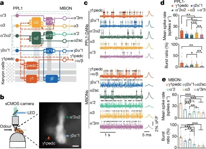 a、PPL1-DAN 和 MBON 的连接。五个 PPL1-DAN 支配蘑菇体的八个区,并调节六个下游 MBON。Kenyon 细胞及其轴突显示为灰色。实线和虚线分别表示前馈和反馈连接。b,左图为电压成像装置。蝇类可以在轨迹球上行走或奔跑,轨迹球记录了它们对气味呈现的运动反应。使用 sCMOS 摄像机对神经活动进行荧光电压成像。用 BioRender.com 制作。右图为 PPL1-γ1pedc、-γ2α′1 和 -α′2α2(蝇系 MB504B-GAL4)中 pAce 电压指示器表达的荧光图像。c, 左图,光学电压轨迹显示 PPL1-DANs 和 MBONs 中的自发尖峰。黑圈表示已识别的尖峰。右图,平均光学尖峰波形。d,e, PPL1-DANs (d) 和 MBONs (e) 的尖峰率(上图)和自发猝发比率(下图)。灰点表示每种细胞类型 20 只苍蝇的数据。*P<0.05,P<0.01,*P<0.001;Kruskal-Wallis方差分析(ANOVA)和Holm-Bonferroni校正的事后U检验。d,e 中的数据为平均值 ± s.e.m。