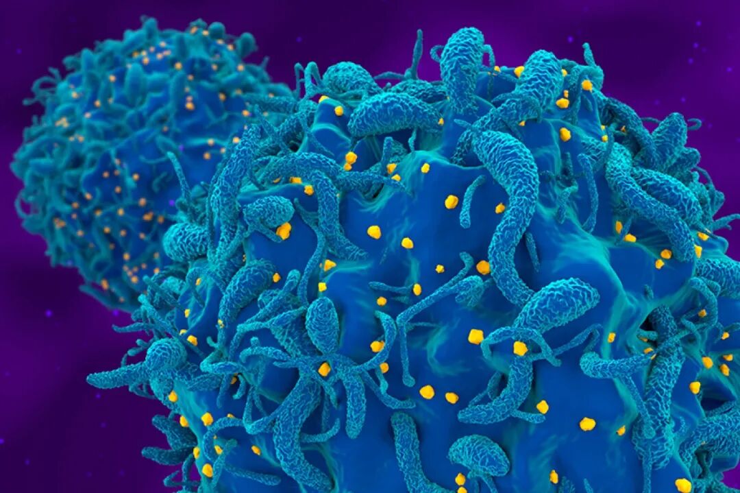 HIV的颗粒(黄色;人工着色)从感染的细胞中冒出。图片来源:Nemes Laszlo/Science Photo Library。