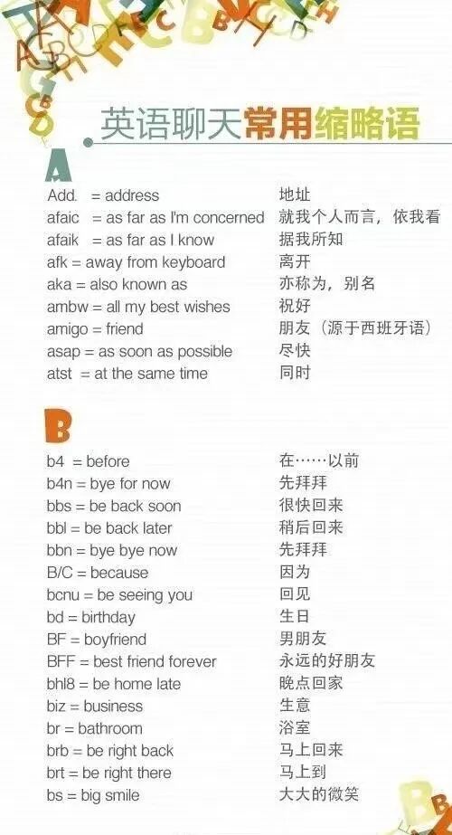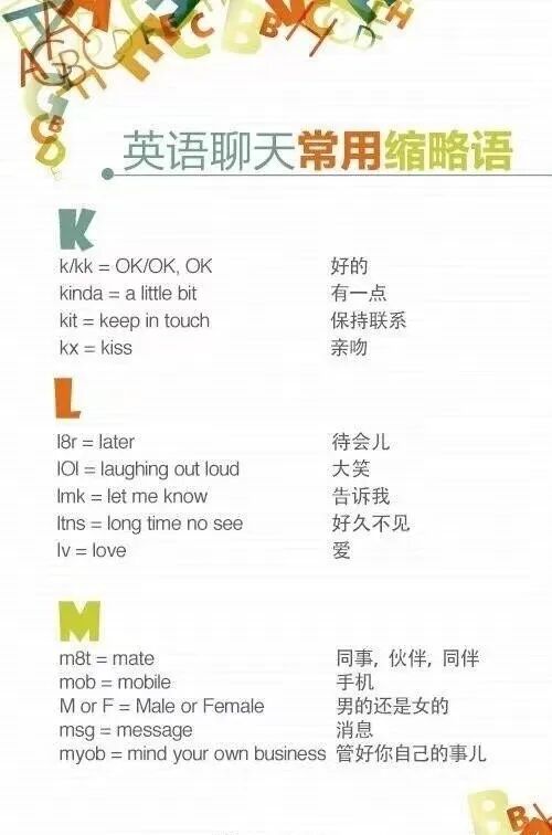 b4、B / C、c u l8r、ditto …这些英文,你知道都是啥意思吗?是不是一头雾水?别担心,这一百多条聊天常用缩略语,让你聊得更顺畅!