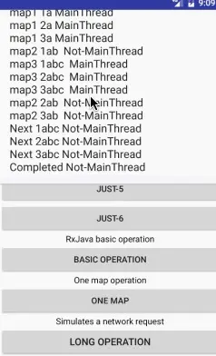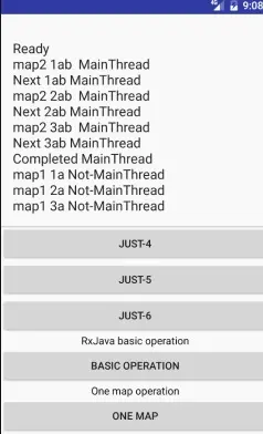 5. 使用Schedulers.io()指定被观察者产生事件的线程,使用Map对数据转换,在每个数据后面加‘a’,使用AndroidSchedulers.mainThread()切换到主线程,然后使用Map变换,每个数据后加‘b’,输出结果。