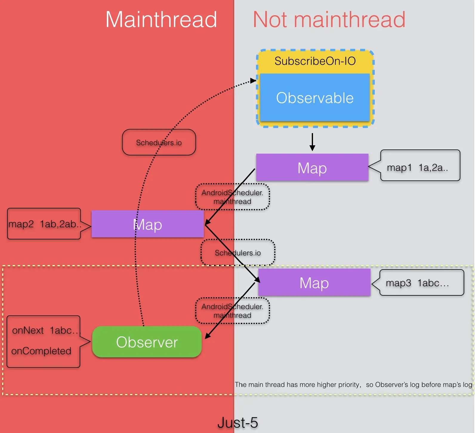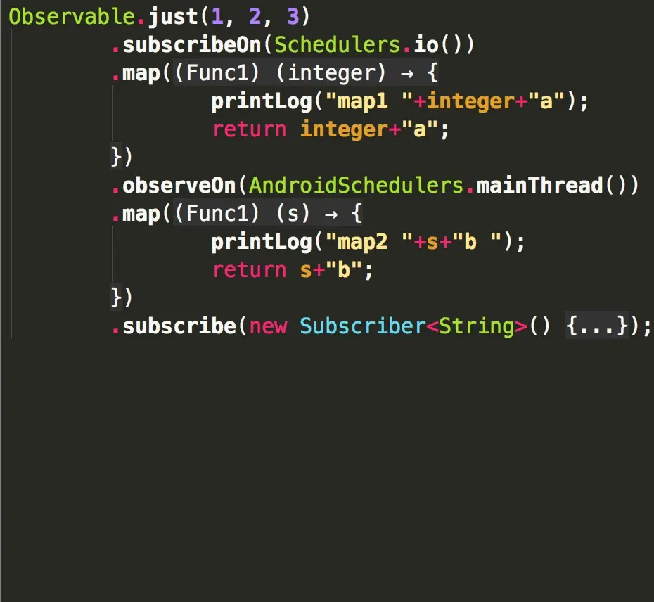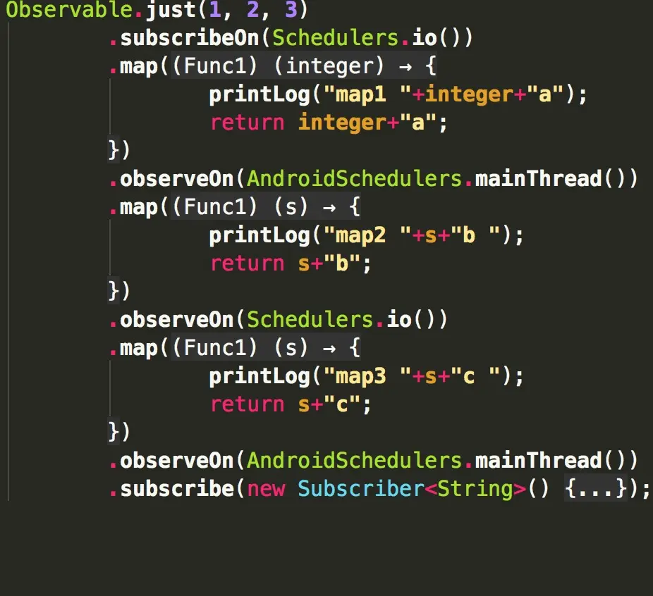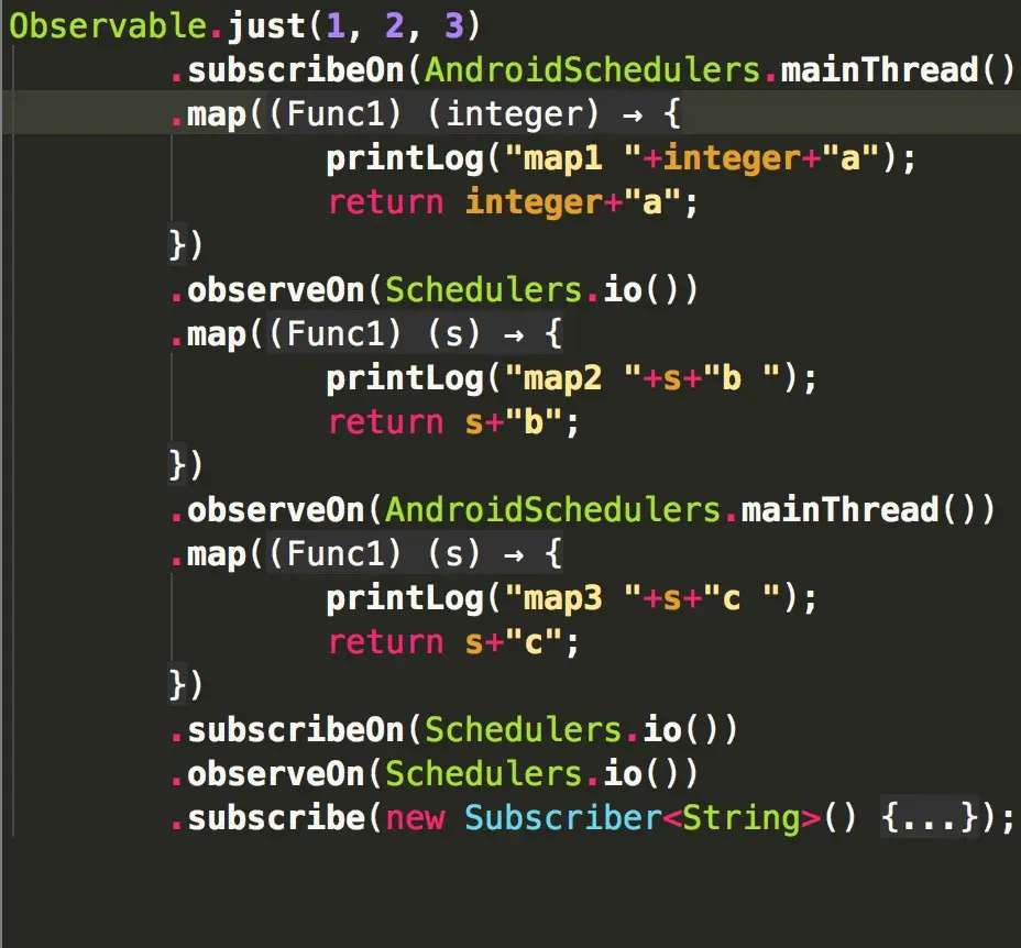 7.这个例子不同的是使用了两次subscribeOn()来指定被观察者的线程,最终最上面的subscribeOn()起作用,下面的subscribeOn()不起作用。然后使用Map对数据转换,这里只是在每个数据后面加‘a’,使用Schedulers.io()切换线程,然后使用Map变换,每个数据后加‘b’,再用AndroidSchedulers.mainThread()切换主线程,用Map对数据加‘c’,最后再切换到非主线程,输出结果。