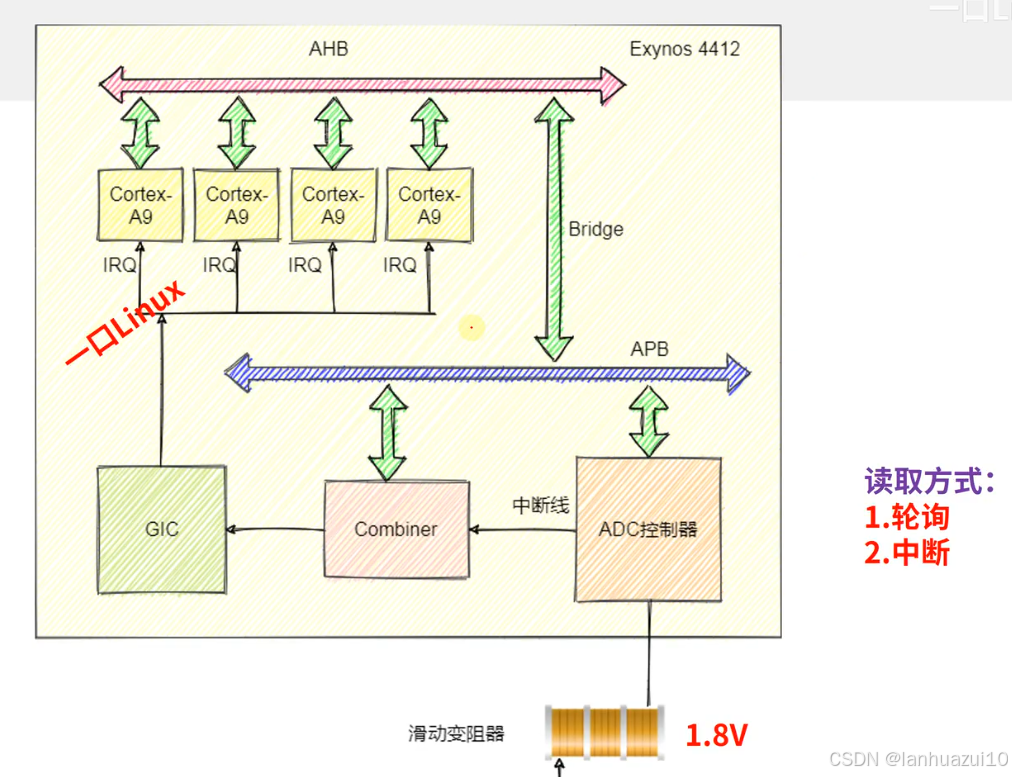Adc控制器集成在exynos4412 soc中,控制器内部有一根中断线连接到中断控制器combiner,然后路由到GIC(Generic Interrupt Controller),滑动变阻器(产生电压差)连接到adc控制器的通道3(XadcAIN3)。