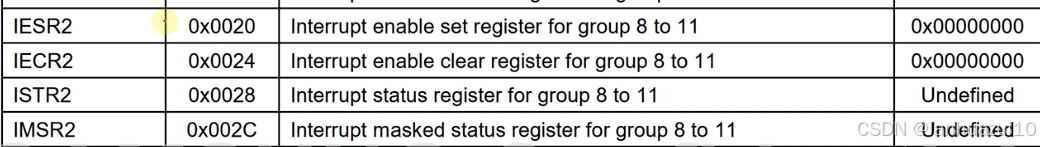 由四组寄存器分别配置管理:IMSRn、IECRn、ISERn、ISTRn (n=0-3)