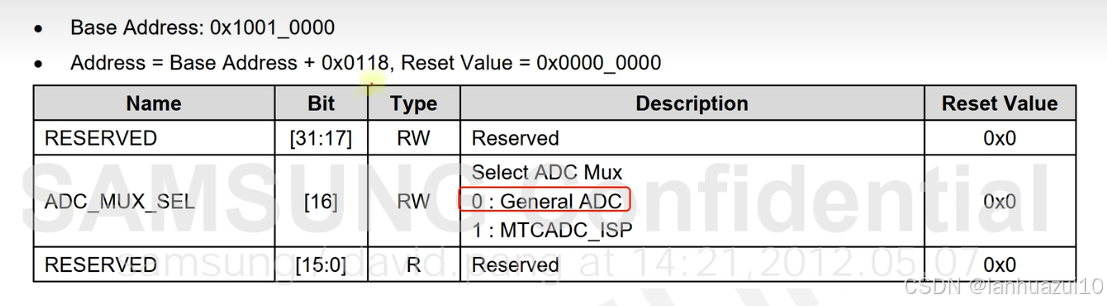 注意该寄存器的值只有低12位有效,跟ADCCON[16]配置有关。adc_num = ADCDAT&0xfff