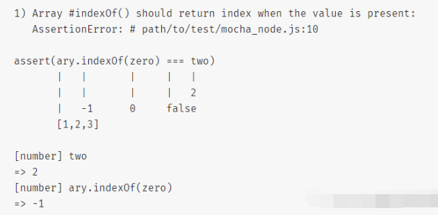 如果你在使用assert的话,无需使用require(‘power-assert’)来引入power-assert,它的API与assert一样,而且拥有强大的提示信息,如下图所示。