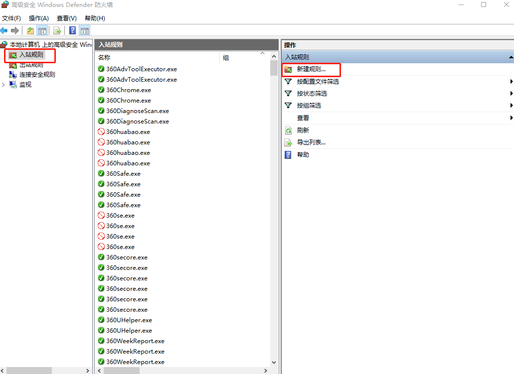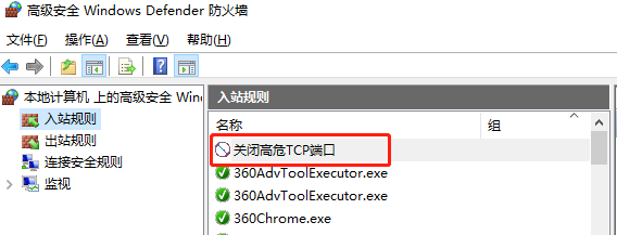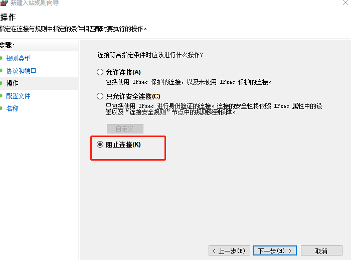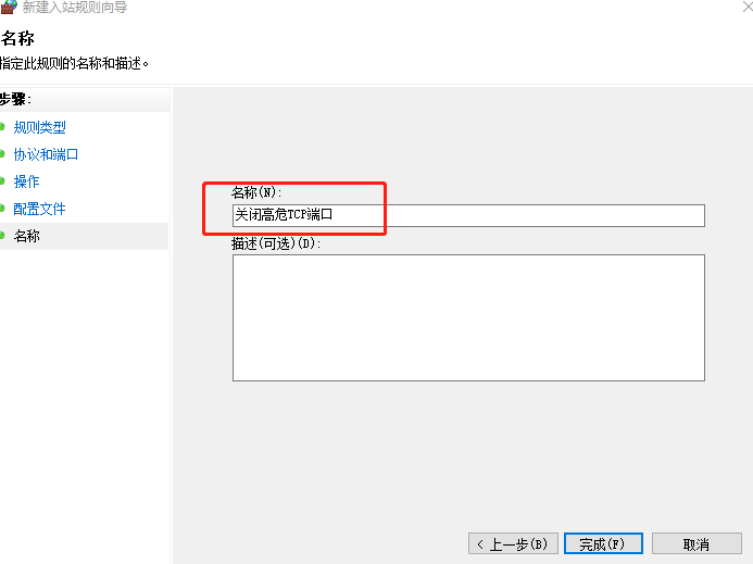 点击【阻止连接】,进入下一步。选择默认的全选应用范围,进入下一步。再根据需要自定义规则名称,例如“关闭高危TCP端口”。完成后,在【入站规则】中会看到添加的“关闭高危TCP端口”的规则。