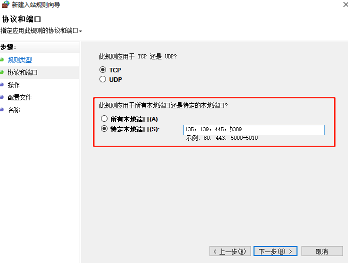 选择【高级设置】,进入高级设置页面,点击左边的【入站规则】,再点击右边的【新建规则】,选择【端口】,进入下一步。其中高危端口135、139、445、3389属于TCP端口,137、138属于UDP端口。将对应的高危端口添加到规则中。
