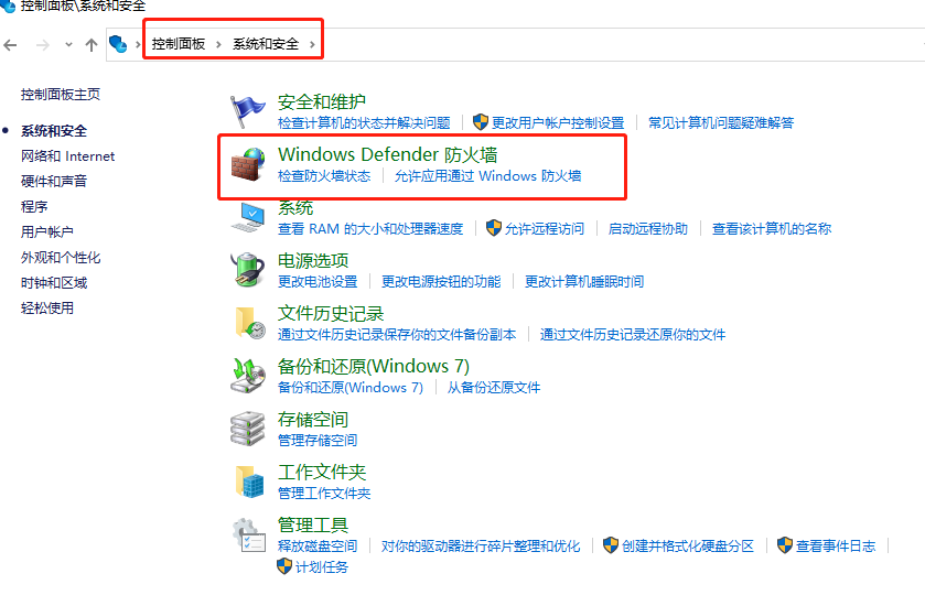 在【控制面板】中选择【系统和安全】,找到【Windows Denfender 防火墙】。