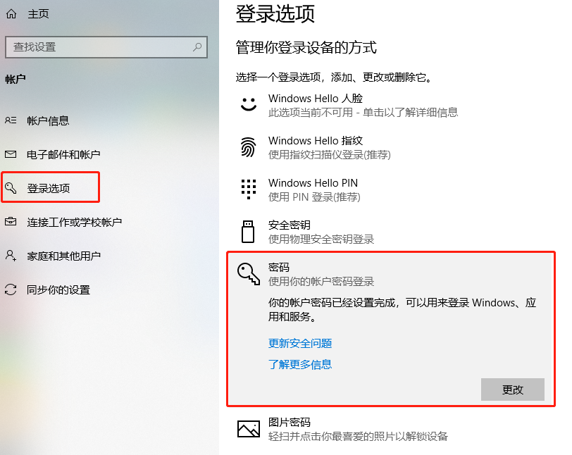 在电脑【设置】中选择【账户】,进入账户设置页面后,可以看到【登录选项】提供了多种登录设置方式,可以点击【密码】,在【密码】中设置复杂密码确保账号安全。