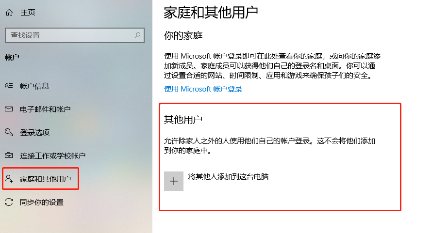电脑的操作系统一般是支持多用户的,不同的家庭成员使用同一台电脑,可以通过设置不同的账号来保留各自对操作系统的环境设置。在【账户】的【家庭和其他账户】中可以设置其他用户的账号和密码信息。如果想创建的是本地账户,可以选择“添加一个没有Microsoft账户的用户”。